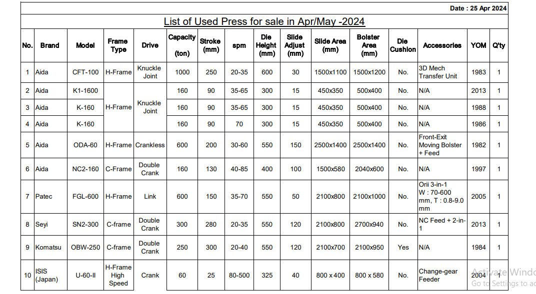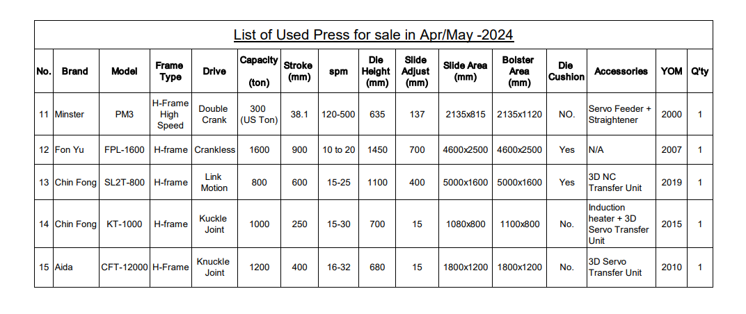 List of Used Press for sale in Apr-May 2024